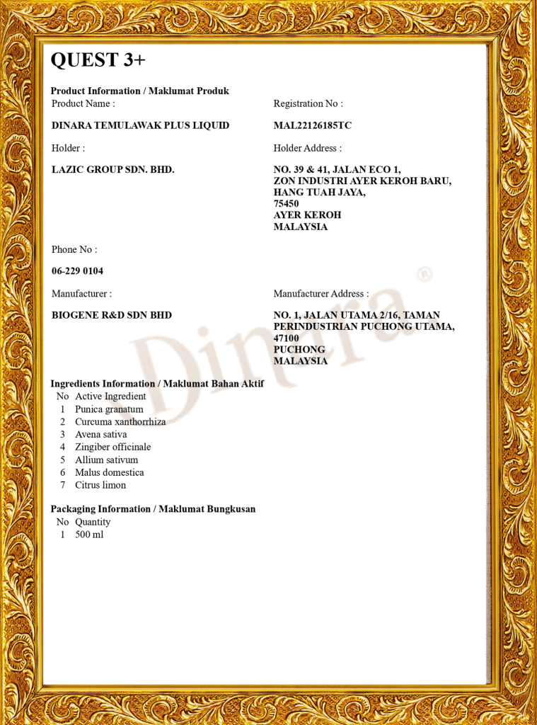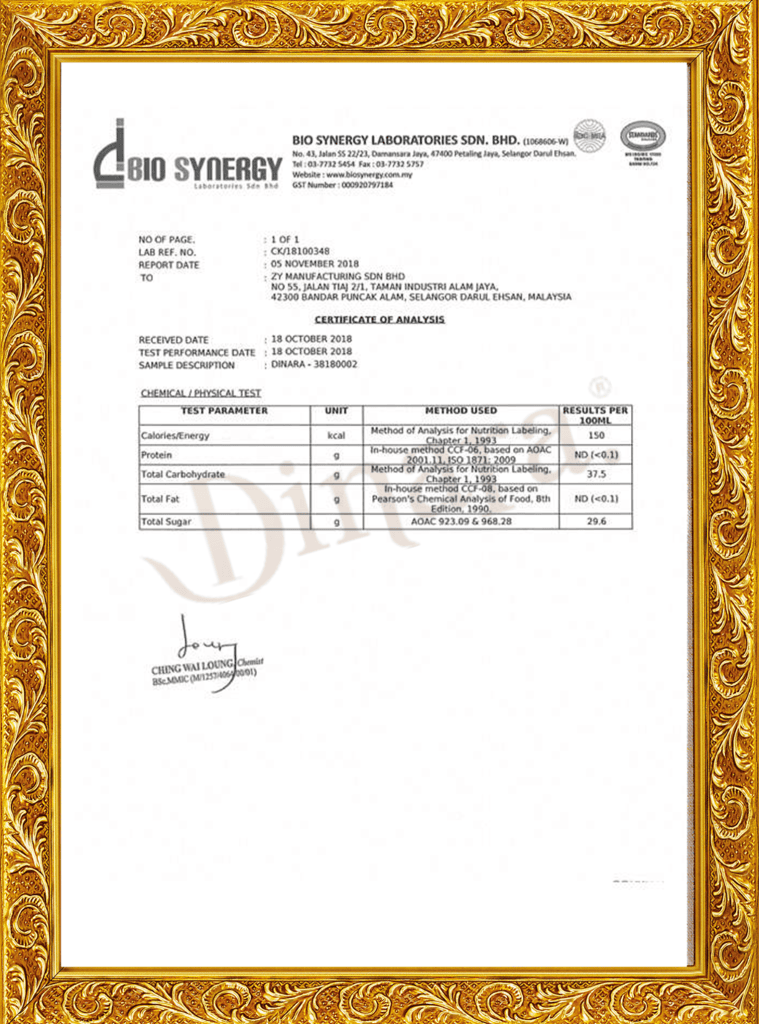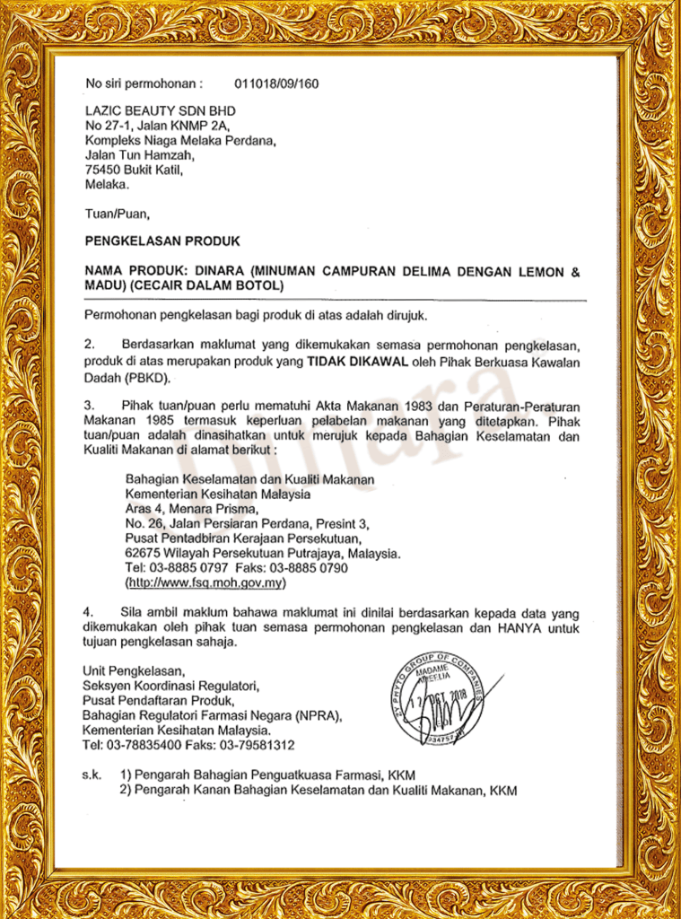 Dinara ini dirumus khas dengan bahan semulajadi dan tak de langsung bahan kimia yang terlarang. Dijamin selamat dengan Kelulusan KKM. Alhamdullilah setakat ini memang tak ada feedback negatif dari pelanggan tentang sebarang masalah komplikasi semasa amalkan Dinara.